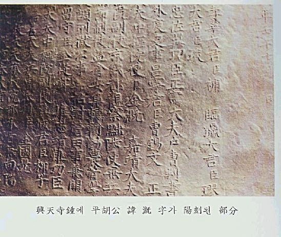 한편, 종구(鐘口)에서 위로 올라온 부분에는 하대(下帶)처럼 묘사된 파도문대가 장식되어 있으며, 횡대와 이 문양대 사이에 장문(長文)의 명문이 돋을새김되어 있는데, 이 종이 왕실의 발원에 의해 세조 8년에 흥천사용으로 제작된 사실과 종을 제작할 당시의 수공업(手工業) 분업 상황 및 직제(職制) 등을 자세히 기록하고 있다.