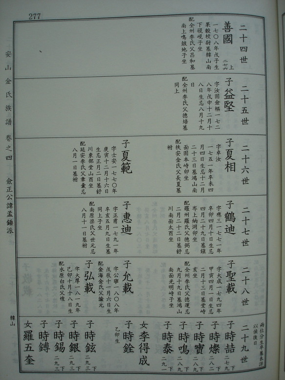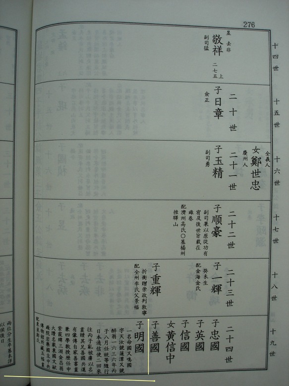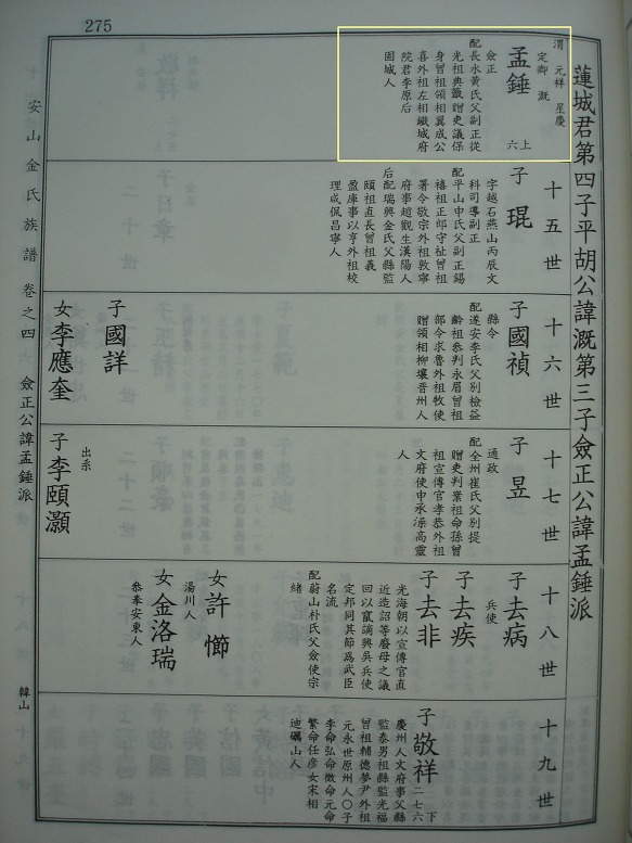 안산김씨는 14세에서 분파되는데 明國(명국)은 첨정(僉正)공파(한산파)