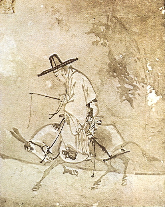 선비가 타고 있는 동물이 왜 말이 아니고 당나귀인가 궁금해하시는 분이 있으면 귀를 자세히 보시면 됩니다. 짧은 말의 귀와는 분명 다른 당나귀 귀입니다. 더구나 조선시대에 말은 엄청난 부의 상징이기에 저런 누추한 집에서 사는 선비가 타고 다닐 수 있는 동물이 아닙니다.