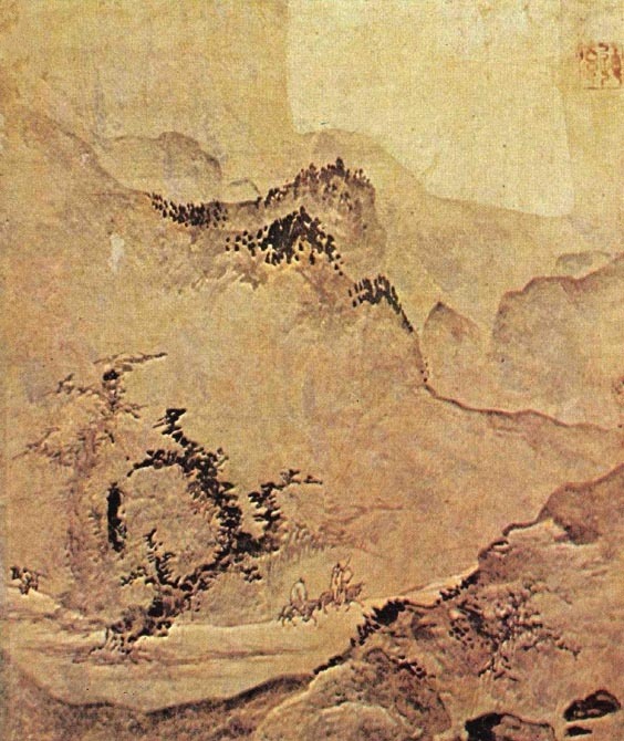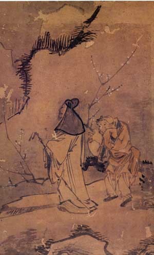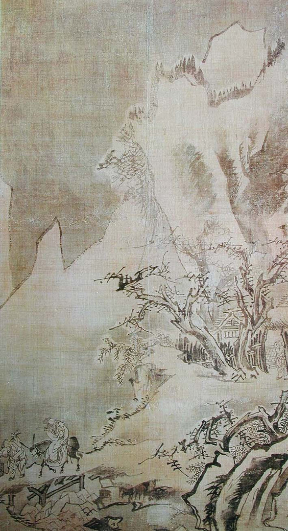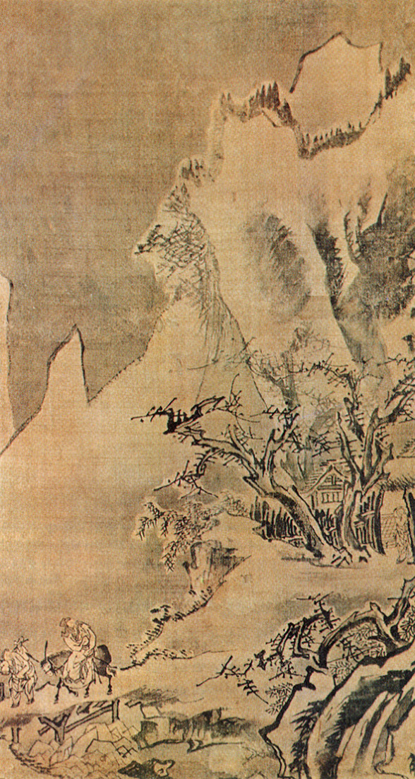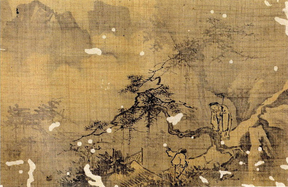 어둠이 채 걷히지 않은 겨울 새벽녘인 듯한 시각에 사립문에 기대어 전송하는 동자와 뒤를 돌아다보며 길을 떠나는 나귀 탄 고사(高士)와 종자(從者)의 송별 장면이 눈 덮인 설경을 배경으로 그려졌다. 중경에 그려진 넘어질 듯 솟아 오른 산의 무게를 대각선상에서 받치면서 화면의 변각구도를 보강해 주고 있는 다리와 그 위의 기려(騎驢)인물은, 패교를 건너 설산으로 매화를 찾아 떠났다는 당나라의 시인 맹호연을 연상케 한다.
