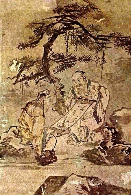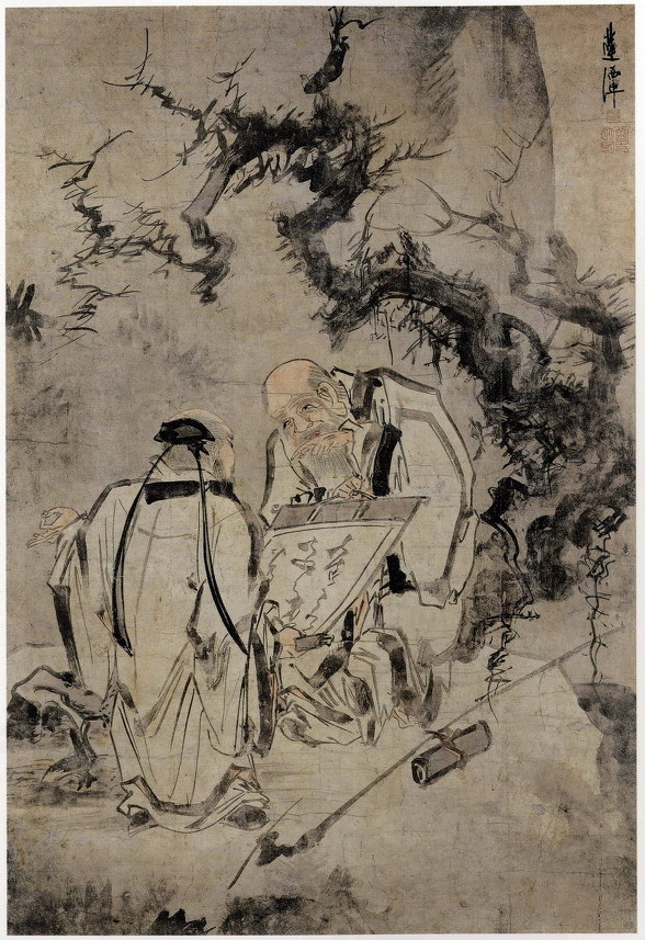 위의 그림을 보자. 이제는 김명국의 작품은 옷자락의 힘찬 필치만 봐도 한눈에 그의 것임을 알아보겠다. 도인 두 명이 비급자료를 두고 서로 토론을 벌이고 있다. 얼굴이 정면으로 보이는 도인은 눈빛이 심상치 않다. 뒤의 고목은 정신이 없는 듯 한 필치이면서도 신비함을 배가 시킨다.