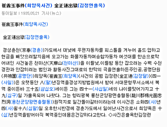 이름/별명 : 김정련(金正連) 당시나이 : 27세 본적/주소 : 전라남도 광주군 효천면 양림리 판결기관 : 광주지방법원형사부 죄명 : 대정8년 제령 제7호 위반, 공갈, 가택침입, 방화미수, 총포화약류 취체령 시행규칙위반 생산년도 : 1921 주문 : 무죄 관리번호 : CJA0001960 판결날짜 : 1921.05.31 M/F번호 : 00960598 |
