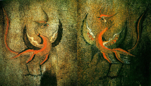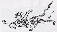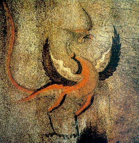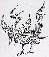 모습은 두 날개를 활짝 펼친 붉은 봉황이다. 때문에 봉황과 동일시 되는 경우가 많으며, 인도 신화에 등장하는 가루다와의 유사성도 제기되고 있다