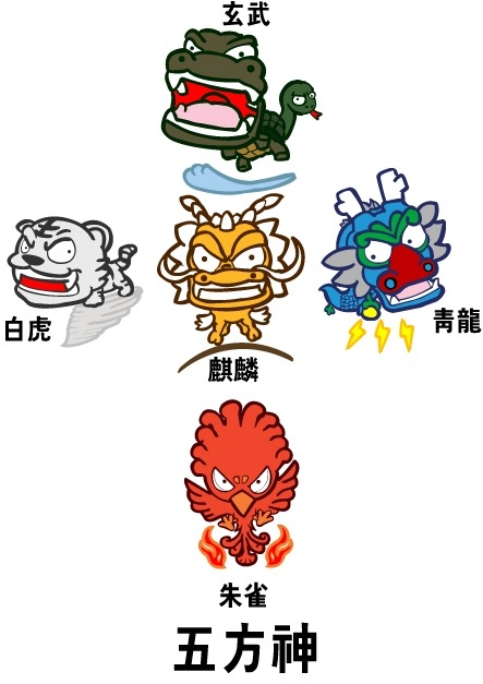 사신은 청룡, 백호, 주작, 현무를 뜻하며 그 색깔이 청, 적, 백, 흑으로 목화금수를 상징합니다. 중앙의 황색을 합치면 청적황백흑의 순서로 목화토금수가 결정됩니다.