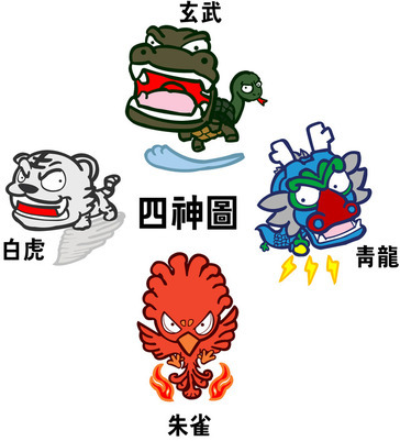 이 네 방위신(方位神)은 각각의 방위(方位)를 수호(守護)하는데, 청룡(靑龍)은 동쪽을 수호하고, 백호(白虎)는 서쪽을, 그리고 주작(朱雀)은 남쪽을, 또 현무(玄武)는 북쪽을 수호한다.