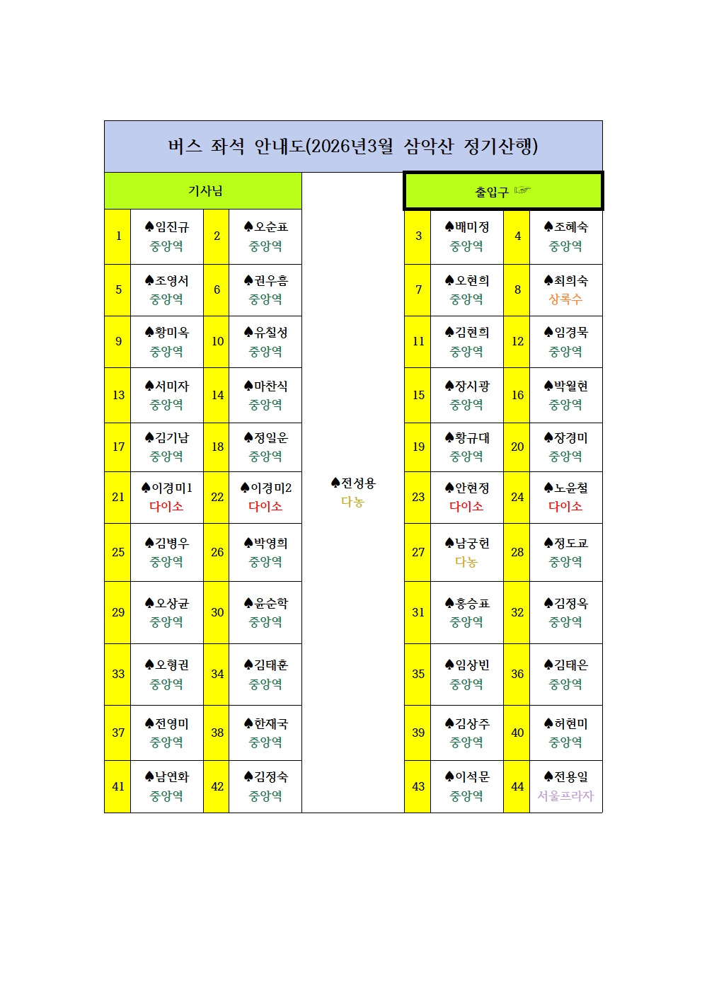 ※좌석은 가급적 희망좌석으로 반영 예정이나 부득이한 경우 임의로 배정될 수 있습니다.