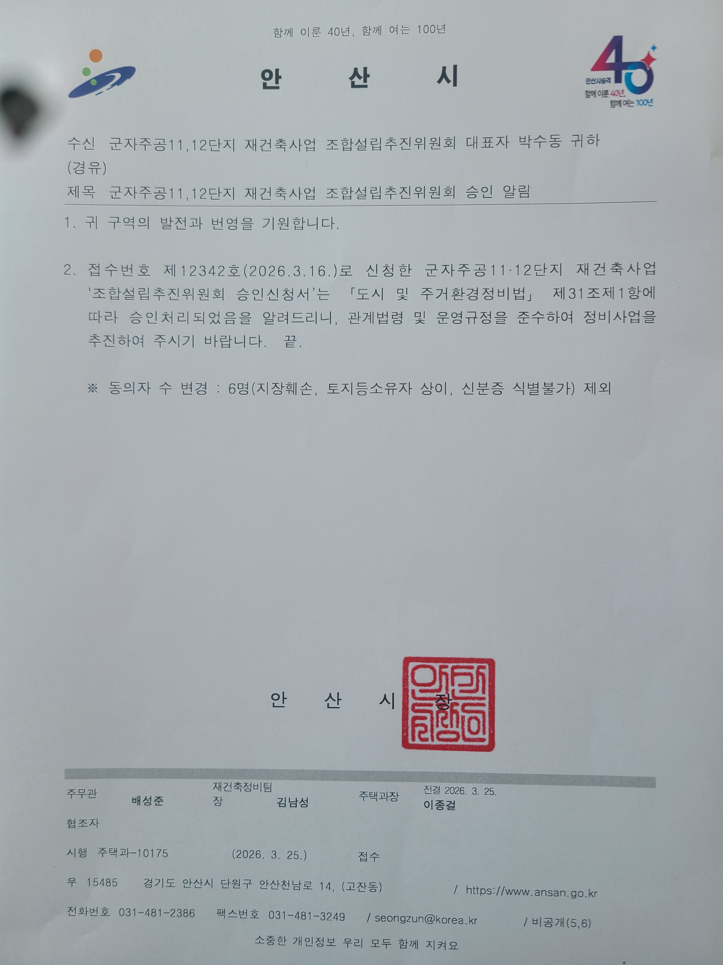 군자주공11,12단지 재건축사업 조합설립추진위원회 승인 알림 작성자운영자|작성시간26.03.26|조회수27 목록 댓글 0 글자크기 작게가 글자크기 크게가 다음검색 현재 게시글 추가 기능 열기 북마크 공유하기 신고 센터로 신고 댓글 댓글 0 댓글쓰기 답글쓰기 댓글 리스트