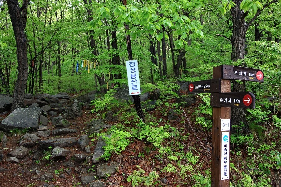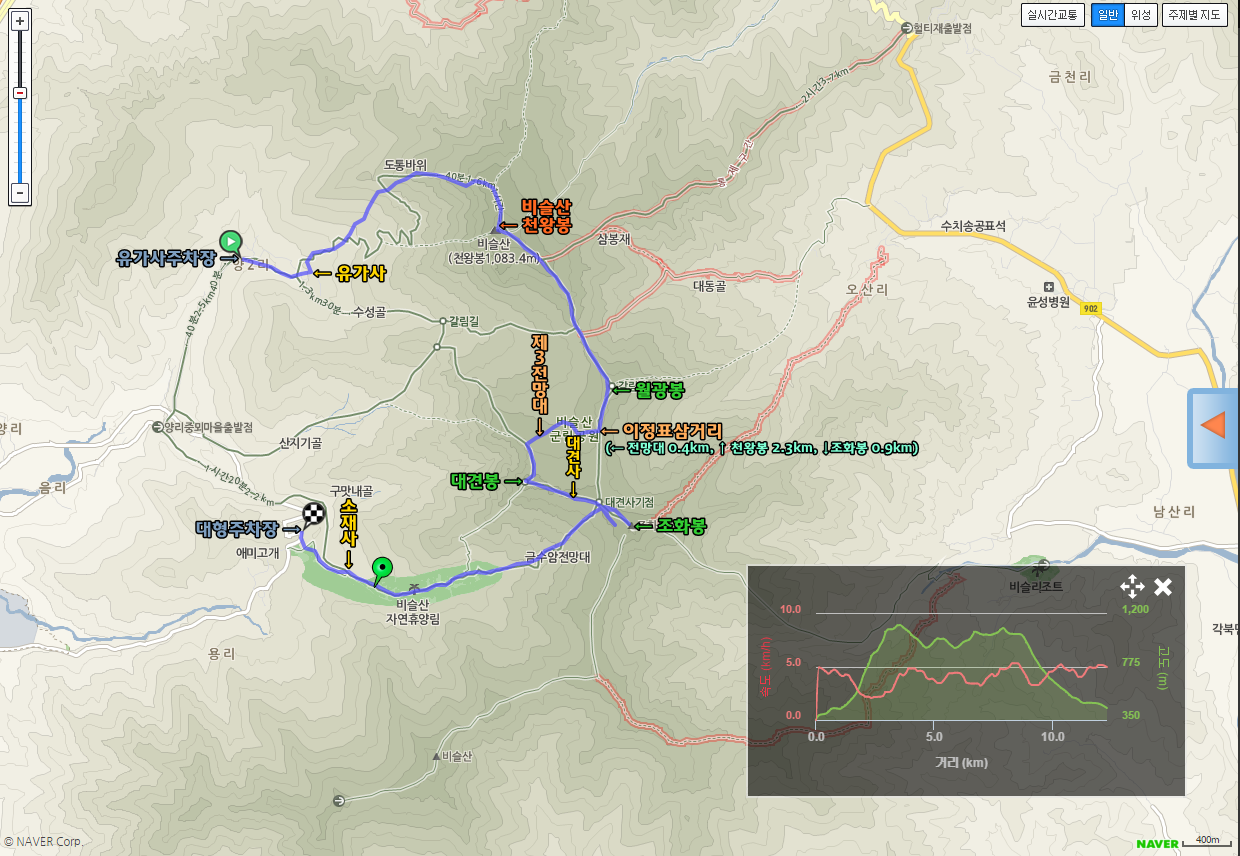 A코스 : 유가사 주차장~유가사 입구~수도암 입구~도통 바위~천왕봉(인증)~마령재~월광봉~참꽃 군락지~대견봉~대견사~휴양림~소재사~휴양림주차장