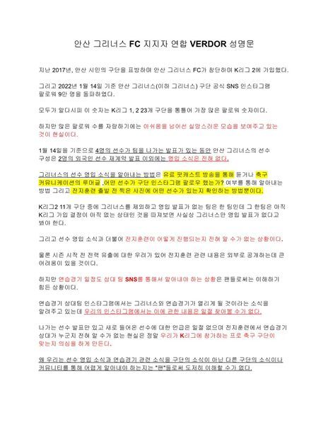 이에 안산 그리너스FC 지지자 연합 VERDOR는 안산 그리너스 FC 구단에게 세 가지의 질문을 한다.