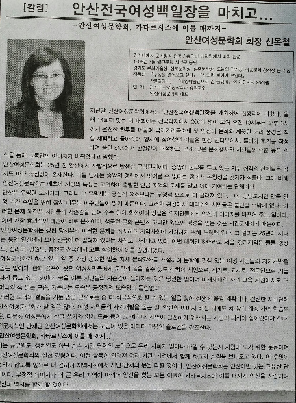 안산여성문학회, 카타르시스에 이를 때까지 / 신옥철(안산여성문학회 회장)
