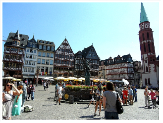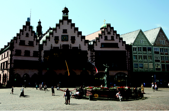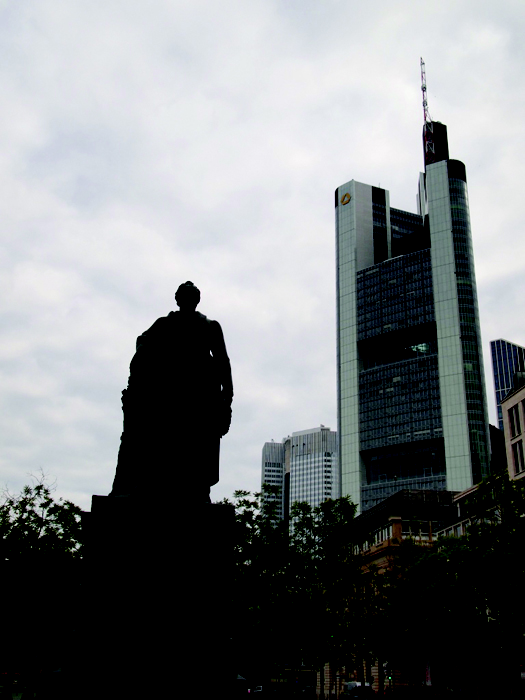- 프랑크푸르트의 괴테 광장에 있는 괴테 동상과 독일에서 가장 높은 건물 코메르체방크 타워