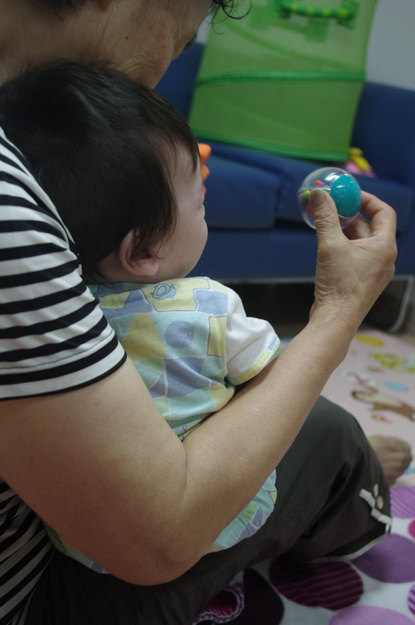딸랑이를 쥐어보기도 해요.