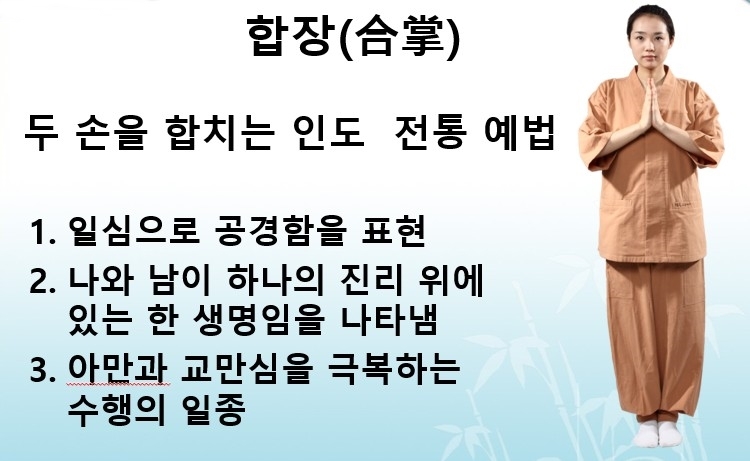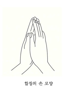 ① 합장(合掌): 두 손을 마주 합하는 자세로, 양손의 손가락을 모두 붙이고 엄지를 손바닥으로 약간 굽혀서 손바닥이 약간 벌어지게 한다.