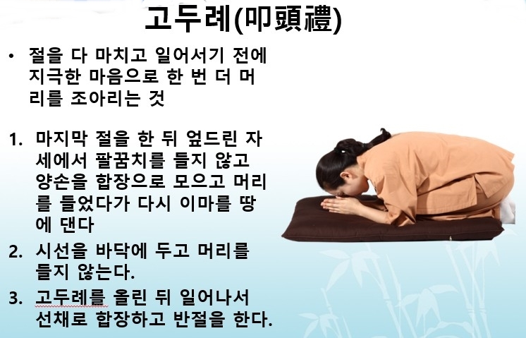 ② 고두배(叩頭拜) : 또는 고두례(叩頭禮), 유원반배(唯願半拜)라고 함. 마지막 절을 할 때는 고두배를 하게 되는데, 고두배란 삼배에 대한 아쉬움의 표시이며, 지극한 존경심에 대한 표현이다.