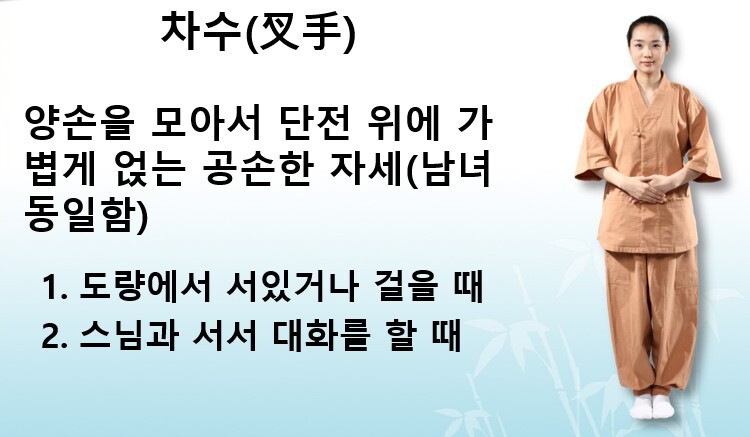 ② 차수(叉手): 두 손을 자연스레 아래위로 교차하여 포갠 손 모양, 경내에서 걸어다닐 때 취하는 자세, 하지만, 현재 선방(禪房)에서 경행시의 차수만 보게 되는 실정이다.