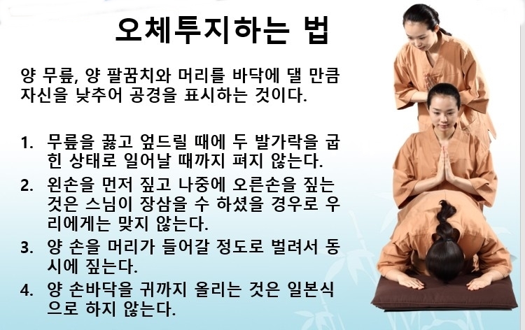 오체투지(五體投地)는 자신의 아만심과 교만을 물리쳐 자신을 낮추는 하심(下心)과 삼보에게 존경심을 표하는 최고의 공경법이다.