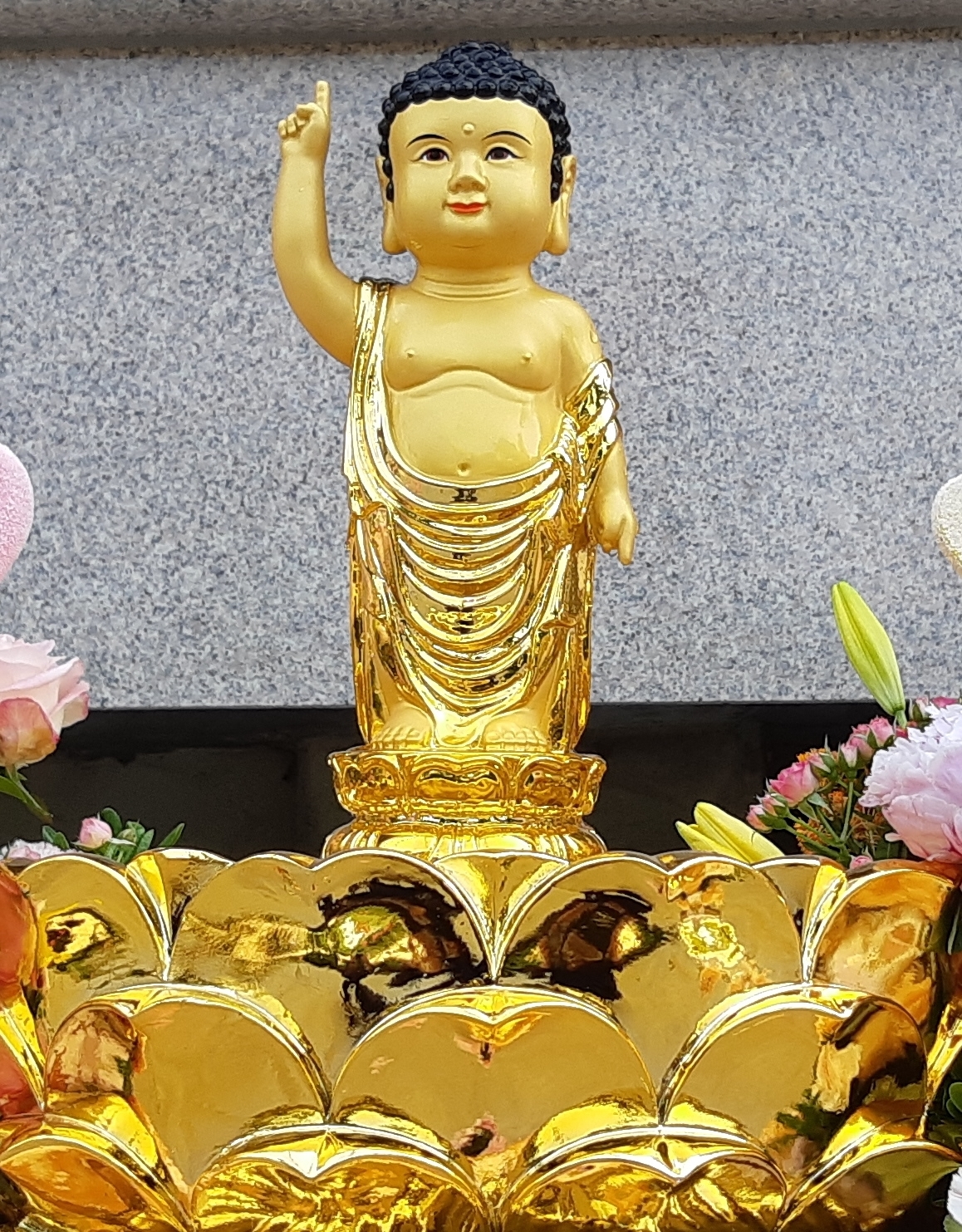 천지인은 탄생불(誕生佛)의 모습이다. 즉, 석가모니가 탄생하자마자 사방 7보를 걷고 한 손으로는 하늘을 가리키고, 또 한 손으로는 땅을 가리키면서 ‘천상천하유아독존(天上天下唯我獨尊)’이라고 한 데서 유래되는 수인이다. 형상은 반라(半裸)에 한 손은 하늘을, 한 손은 땅을 가리키는 모습이다.