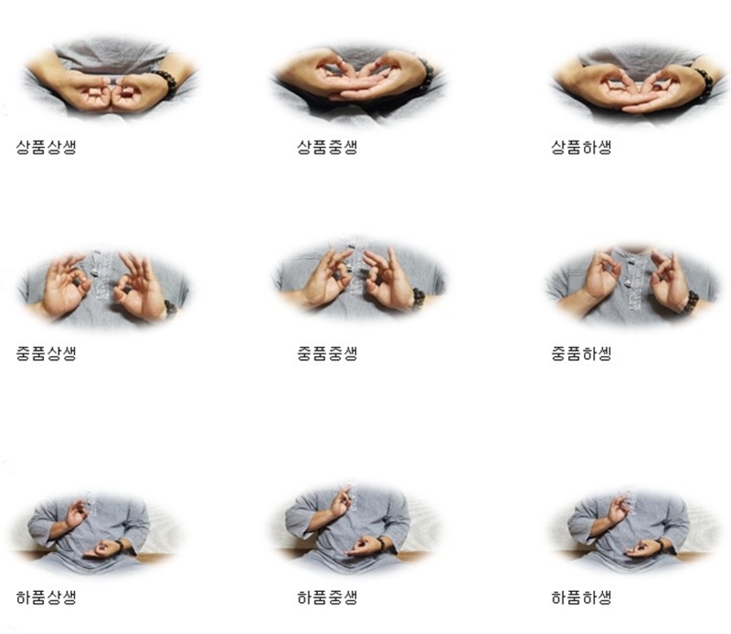 이들 가운데 먼저 상품상생인(上品上生印)은 선정인과 동일한 것으로 왼손 위에 오른손을 놓고 손바닥을 위로 하여 집게손가락을 구부려 엄지에 댄다. 그리고 상품중생인(上品中生印)은 같은 손모습에서 중지를 구부려 엄지에 대며, 상품하생인(上品下生印)은 무명지를 구부려서 엄지에 대는 모습으로 된다.