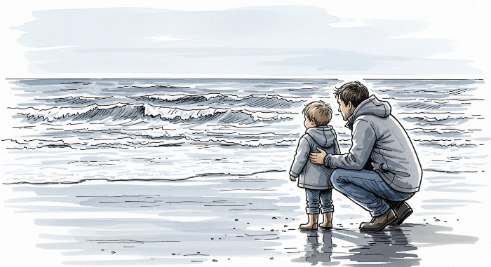 바다는 단순히 물의 집합이 아닙니다. 아이에게 바다는 처음 마주하는 무한의 물리적 실체입니다. 끝을 알 수 없는 수평선, 쉼 없이 밀려오는 파도, 발밑의 지지력을 흔드는 물결 앞에서 아이는 단순한 풍경이 아니라 자신을 넘어서는 어떤 거대한 실재와 마주합니다. 그래서 아이의 속삭임, “아빠, 제가 바다를 ‘보는’ 것 좀 도와주세요”는 단순히 시각적 정보를 처리해달라는 요청이 아닙니다. 자신의 작은 눈동자와 작은 마음에 다 담기지 않는 거대함을 감당할 수 있도록, 마음의 지지대를 세워달라는 고백에 가깝습니다.
