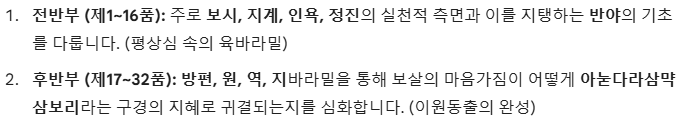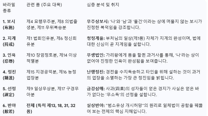 육바라밀의 관점에서 보면, 경전은 **'무주상(無住相)'**이라는 하나의 원리가 각 바라밀에 어떻게 투영되는지를 단계적으로 보여줍니다.