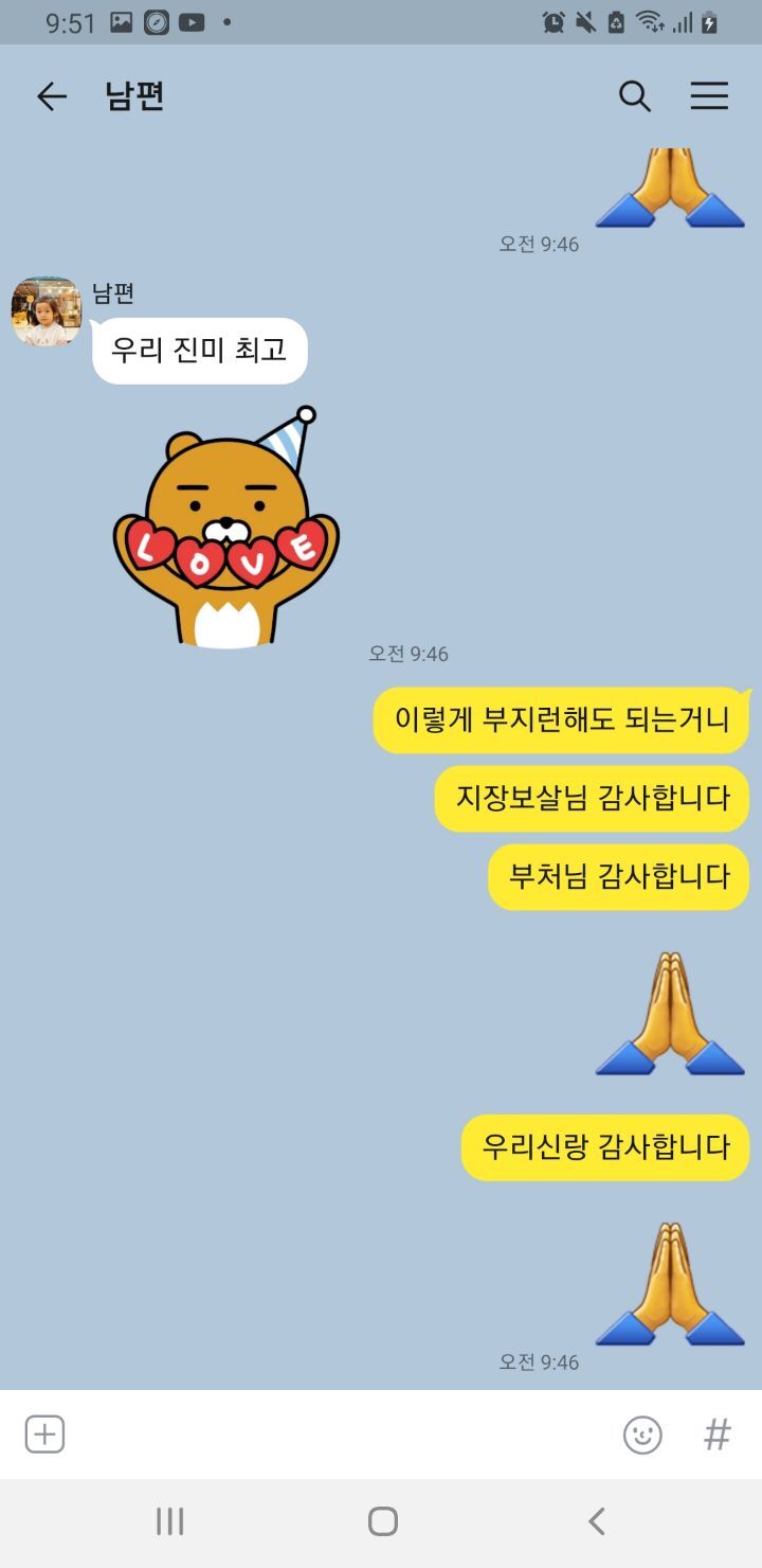 남편이 저에게 오늘 사람은 바꿔쓰는게 아니라던데 이렇게 바뀌어도 되는거냐며 부지런해지고 화도 안내는 제 모습을 보며 본인도 지장보살님께 감사하다고 합니다^^