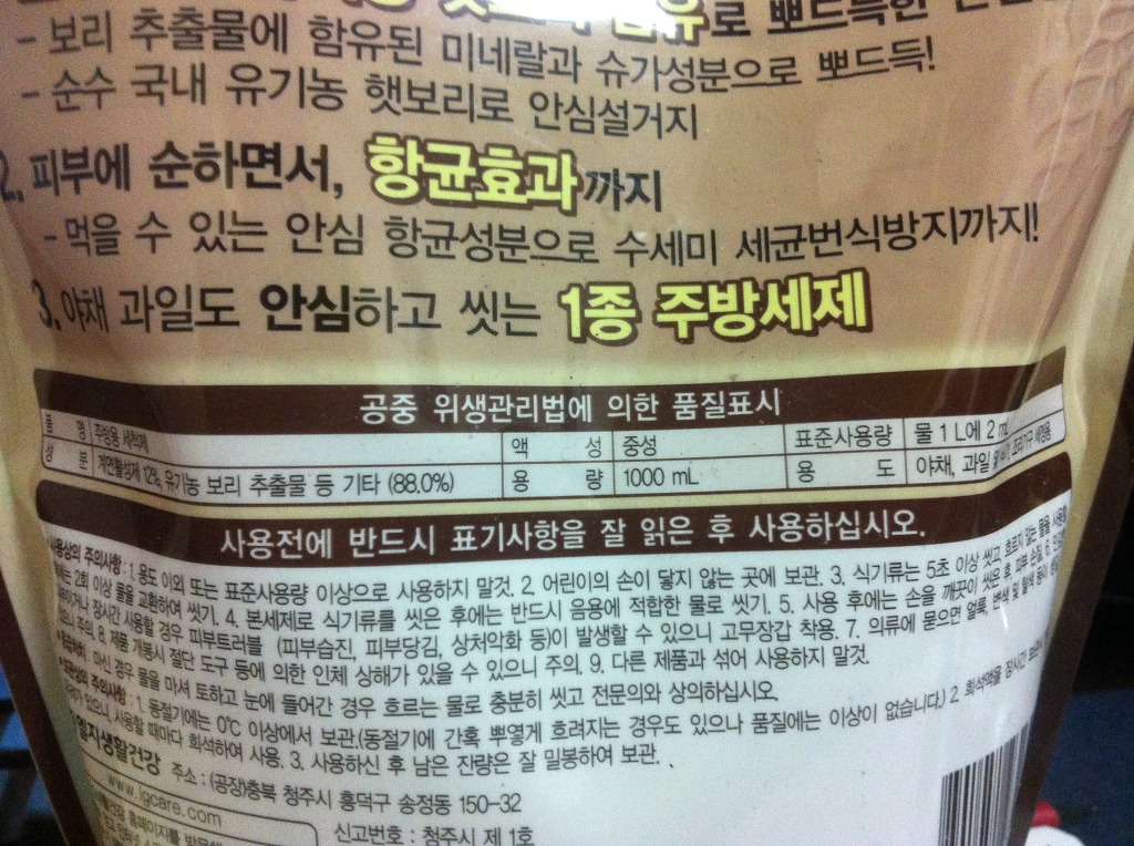 우선 1종 주방세제이며, 표시성분은 계면활성제12%, 유기농 보리 추출물 등 기타 (88.0%)라고 씌여있습니다.