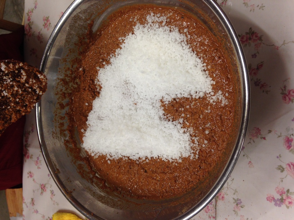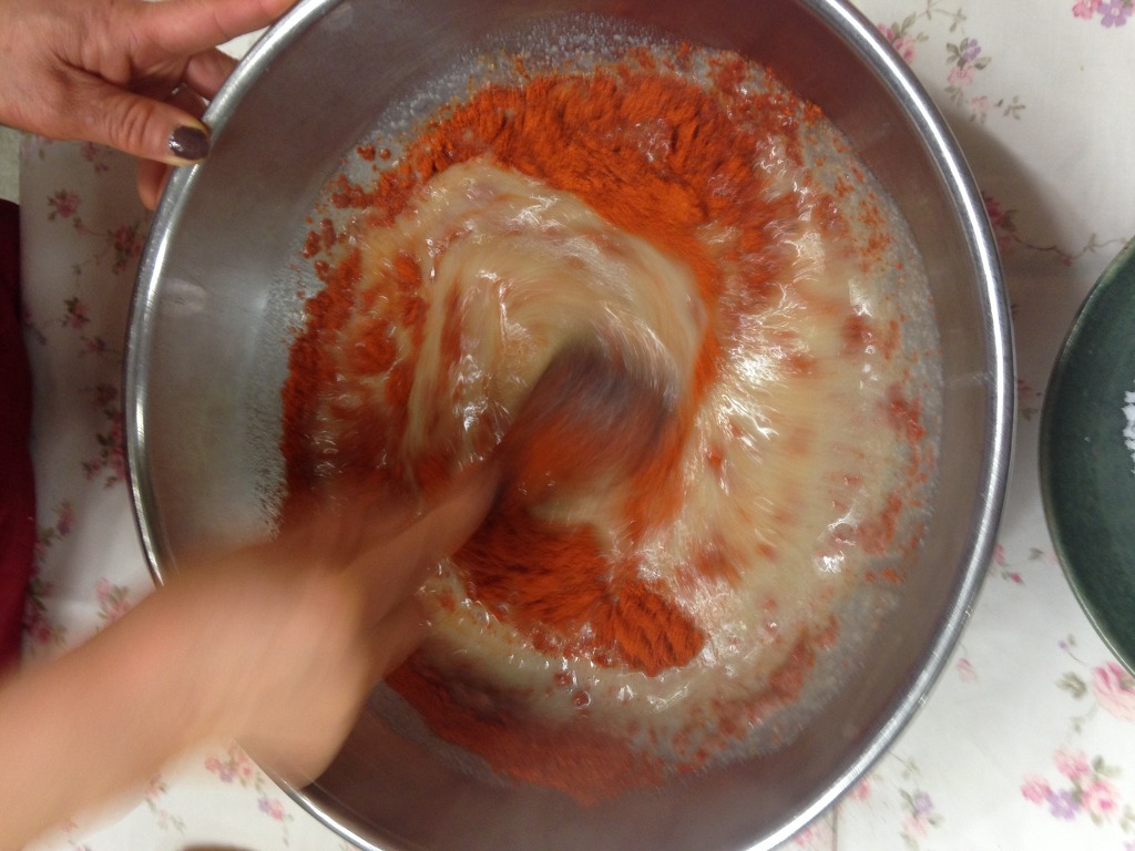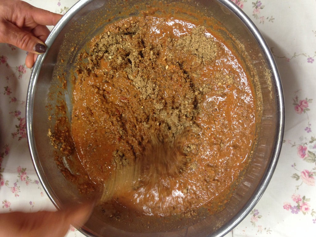 5. 완선된 보리죽을 한 김 식혀 준비해둔 메주가루, 고춧가루, 소금을 넣고 버무린다.