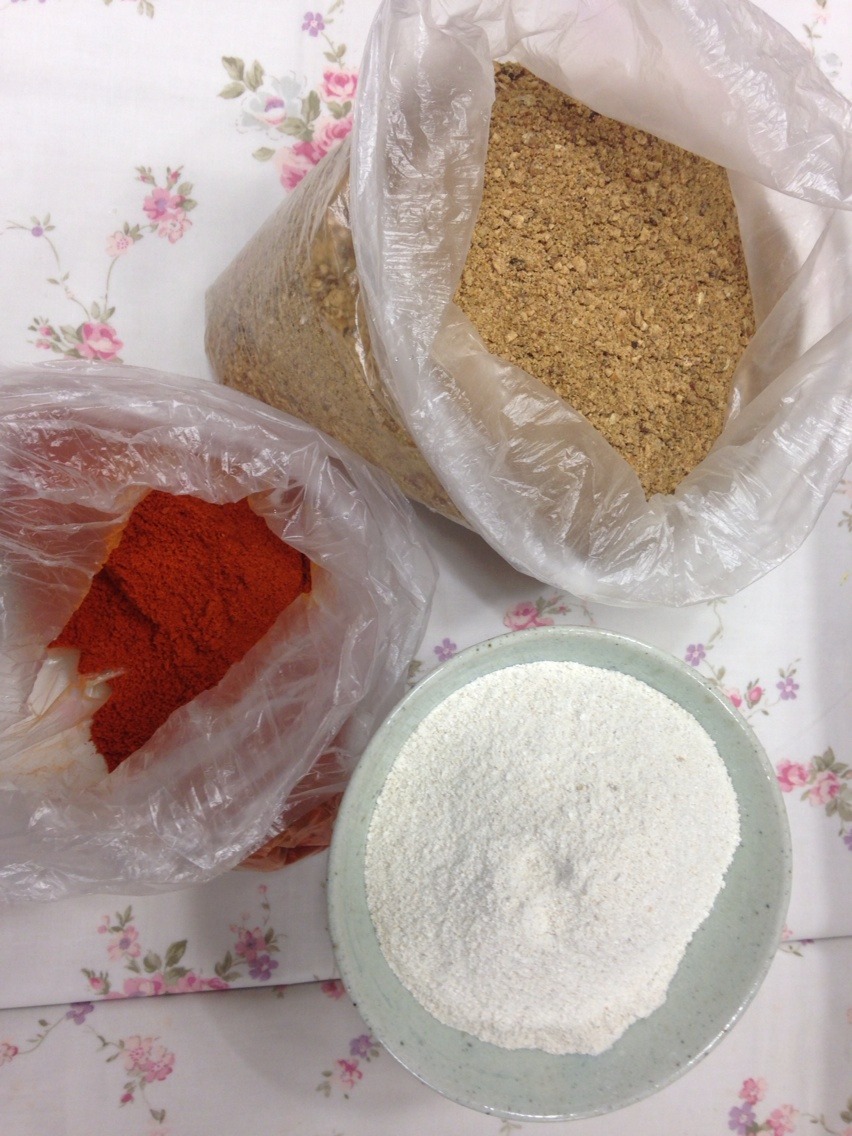 메주가루 1kg, 고추가루100g, 보리가루 200g, 엿기름 200g, 소금500g, 물 2L