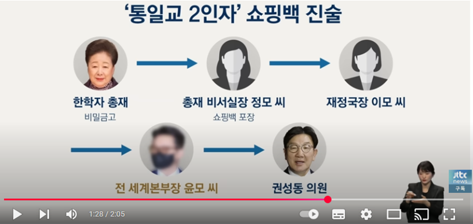 그리고 2025.08.07. JTBC뉴스에서는 “통일교 한학자 금고→ 최측근 포장 → 2인자→권성동” 이라는 구체적인 보도도 하였다