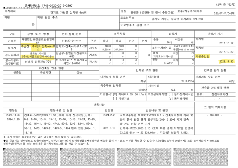 천원궁은 2017. 10. 12. 건축허가를 받아 2017.12.22. 착공을 하여 6년 후인 2023. 11.30. 사용승인을 받았다. 즉, 대부분의 공사가 완료되었다는 것을 의미한다.