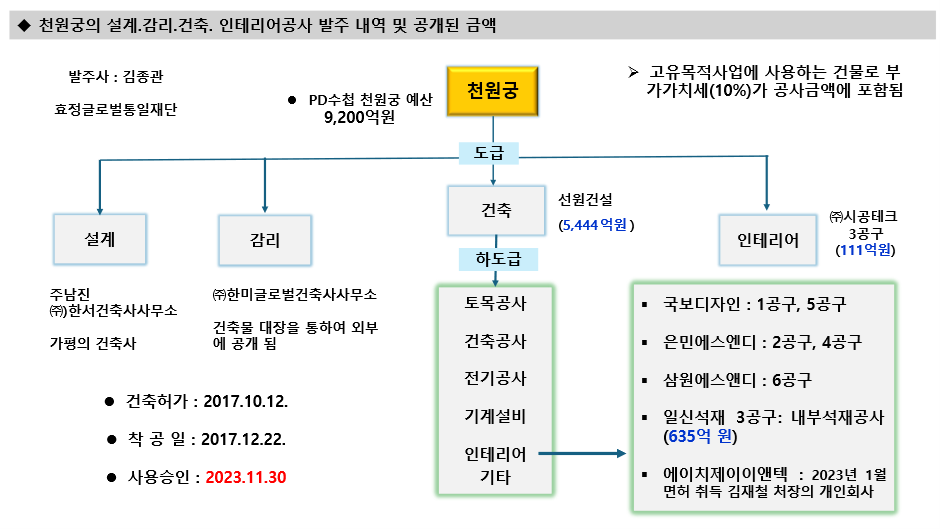 지난 22일 방영된 PD수첩에서는 통일교의 회계자료를 제보 받아 예정된 천원궁 공사금액이 9,200억 원으로 2023년 11월 기준 자금집행 누계액이 7,100억원이라고 하였다.