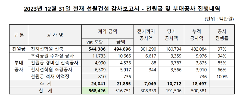 2023년 선원건설의 감사보고서 도급공사내역을 통하여 천원궁 공사가 완료되었다는 것을 바로 알 수 있다.