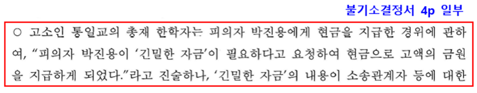 김석병 이사장은 명확히 조광수가 법적인 부분도 잘 알고 있기에 고소대리인으로 시켰다고 진술하였다. 그런 조광수 고소대리인이 한학자 총재가 박진용 변호사에게 현금을 주었다는 진술서까지 중앙지검에 제출하였다는 것은 의도적이었다고 밖에 볼 수 없는 중요한 내용이다.