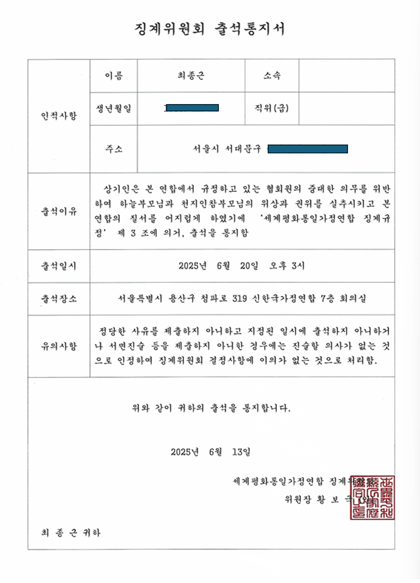 이청우 실장의 윤영호 꼬리 자르기 – 통일교, 윤영호와 최종근에게 징계위원회 출석 통지 (2025-06-16)