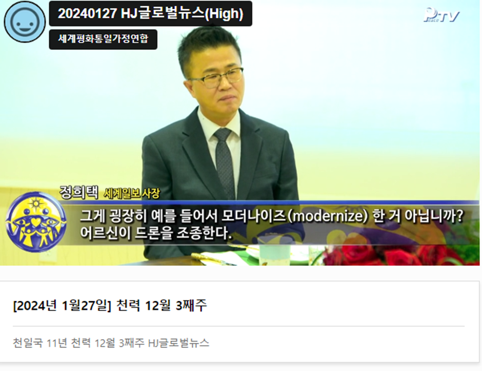 HJ글로벌뉴스에서는 2024년 1월 20일 영상에 이어 2024년 1월 27일 HJ글로벌뉴스에서도 통일교의 실질적 책임자로 통일교의 섭리를 주관하는 정원주의 입맛에 맞춘 소식을 전하였다.
