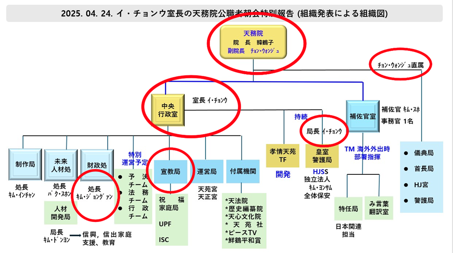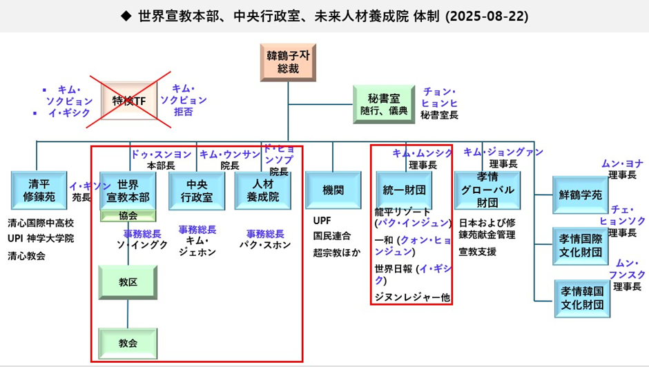 韓総裁は2025年8月15日、チョン・ウォンジュが米国から連れてきた姻戚にあたるトゥ・スンヨンを世界宣教本部長に、ソ・イングクを事務総長に、キム・ムンシクを統一財団理事長に、キム・ウンサンを中央行政院長に任命した。チョン・ウォンジュは、万一、自分が特検により逮捕されるたとしても、統一教会の権力を維持・掌握できる体制を作り上げたのである。