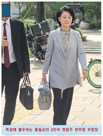 ▲特検に出頭する統一教会ナンバー2のチョン・ウォンジュ天務院副院長