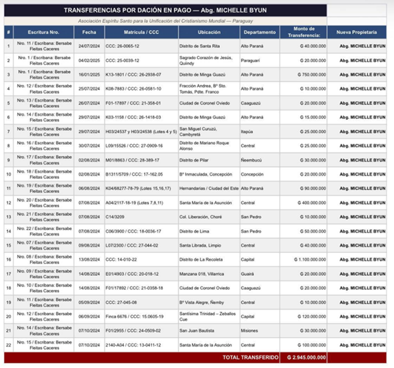 内部告発者によれば、その日、パラグアイ統一教会の会長(エバリスト・フェルナンデス)は、統一教会世界本部の指示に従い、総会でミシェル・ビョンへの資産移転案を強制的に批准させたという。その批准により、理事会と総会は公式に教会の資産がこの弁護士に移転されたことを認めることとなった。