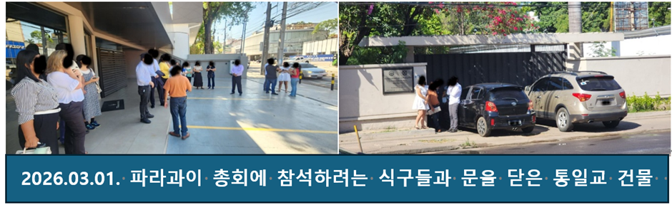 パラグアイで資産移転に反対していた食たちは、2026年3月1日のパラグアイ統一教会総会に参加するため、現地の教会建物を訪れた。しかし、指導部は食口たちが総会で懸念を表明することを許さず、代わりに警備員を雇い、門に鍵をかけて出入りを阻んだ。