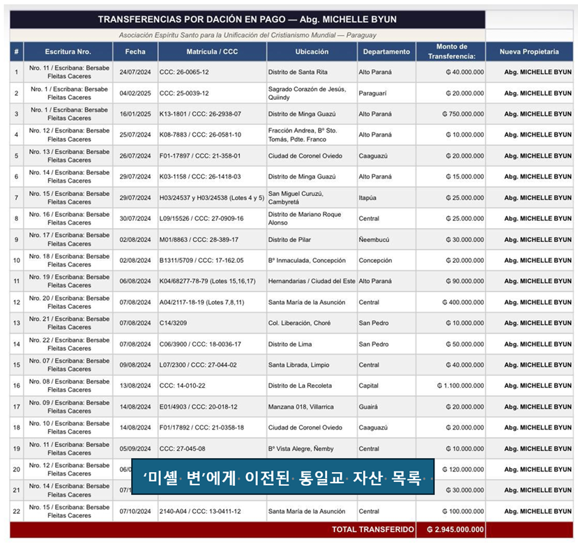 ▲ミシェル・ビョンに移転された統一教会の資産目録
