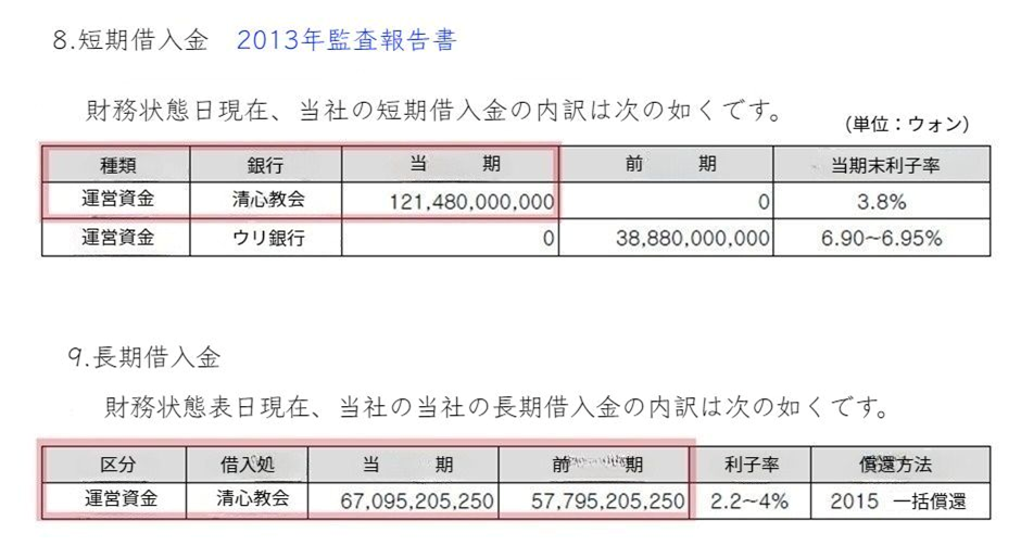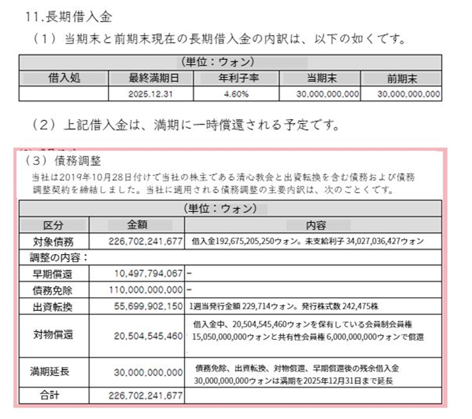 シン・ダルスン代表理事は会社の財務諸表を良好に見せるための作業として、2019年、清心教会の貸与金216億円から110億円は債務を免除、55億円は出資、20億円は会員権の買い入れ、そして30億円は満期を延長するという形で処理した。