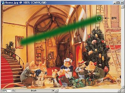 2. [Shift]를 누르고 잇는 상태에서 이미지 창에서 다른 위치에 브러시를 클릭을 합니다. 첫번째 클릭한 부분과 직선으로 연결을 하여 브러시가 칠해집니다.