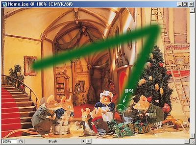 기본적으로 브러시툴은 전경색의 색상으로 칠해지며 이 때 브러시를 사용을 하기전 채색을 하고자 하는 색상을 선택을 한 후 원하는 부분에 채색을 하시면 됩니다.