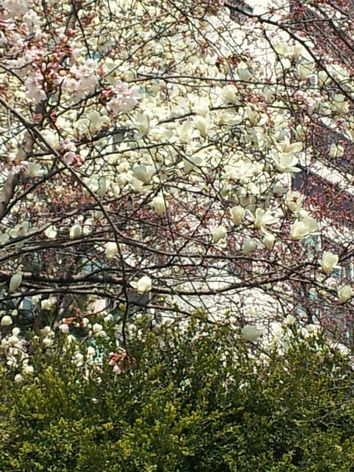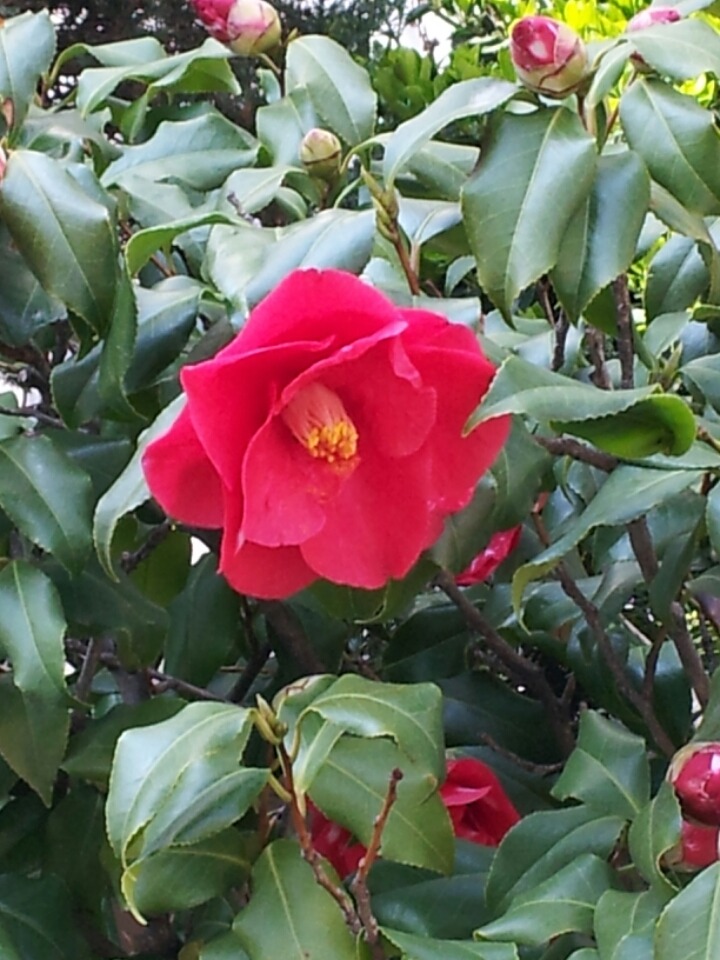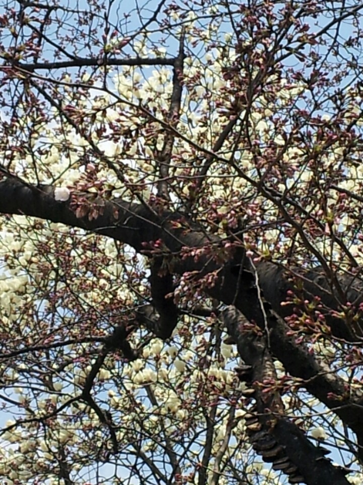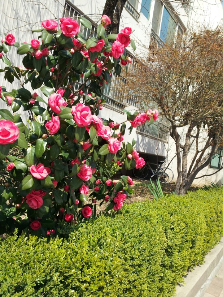 화단 곳곳엔 벌써 피어난 붉은 동백이 화려 하게 벚꽃과 뽐내기하듯 얼굴을 쳐 들고 있습니다