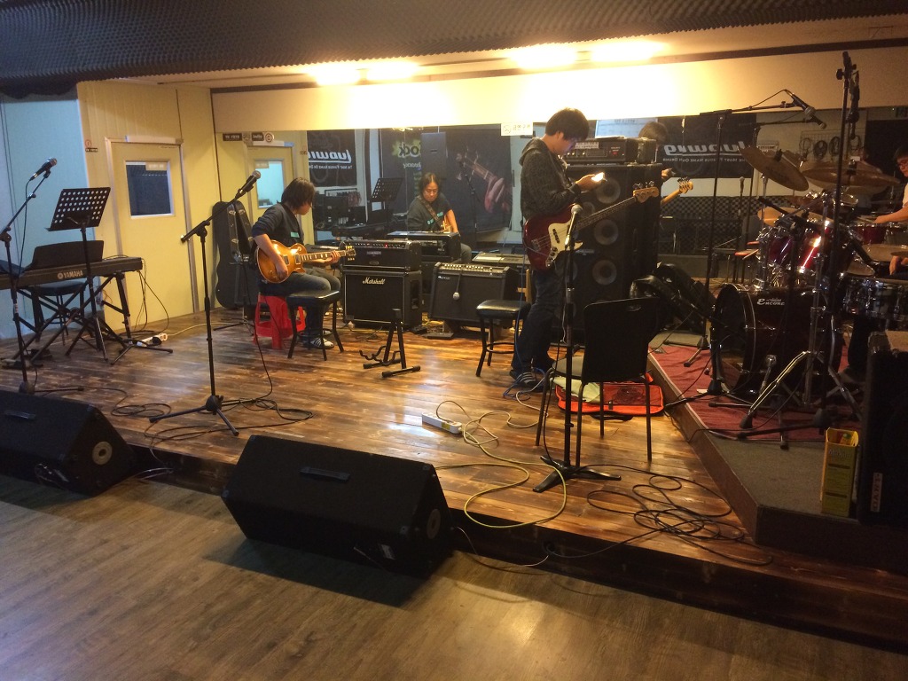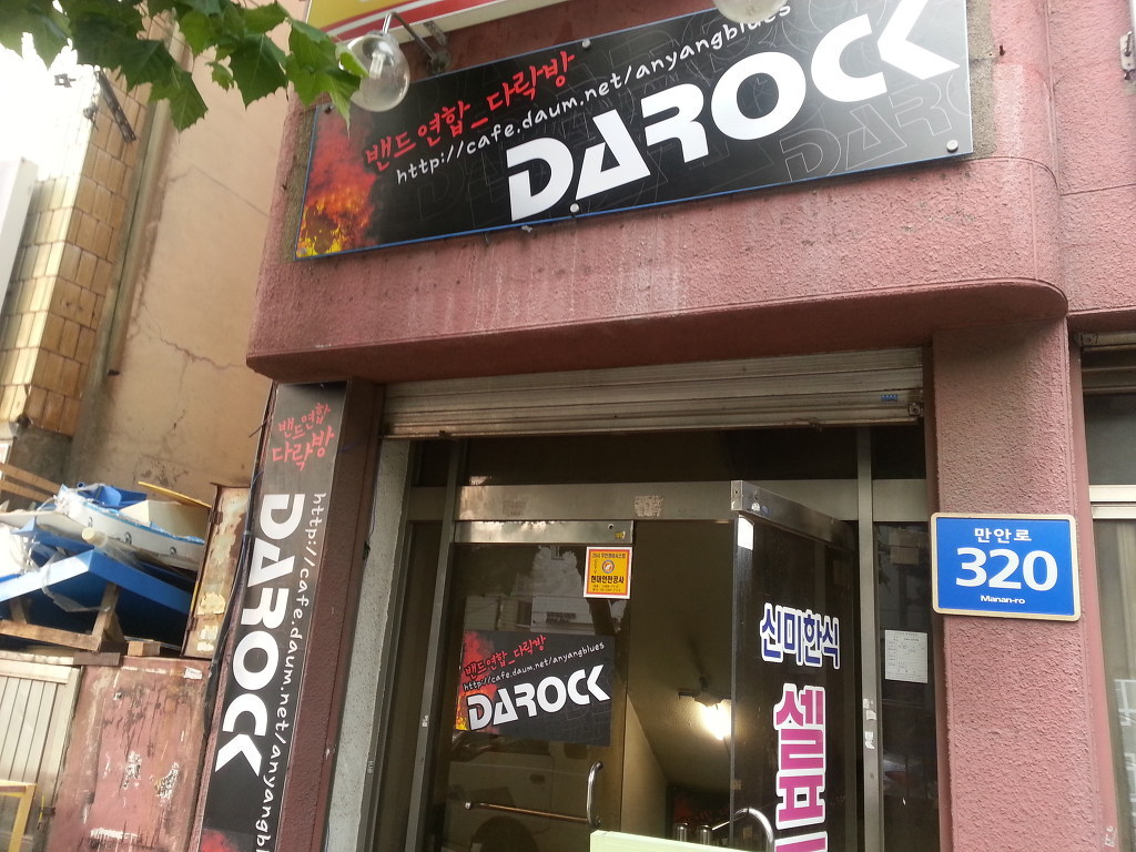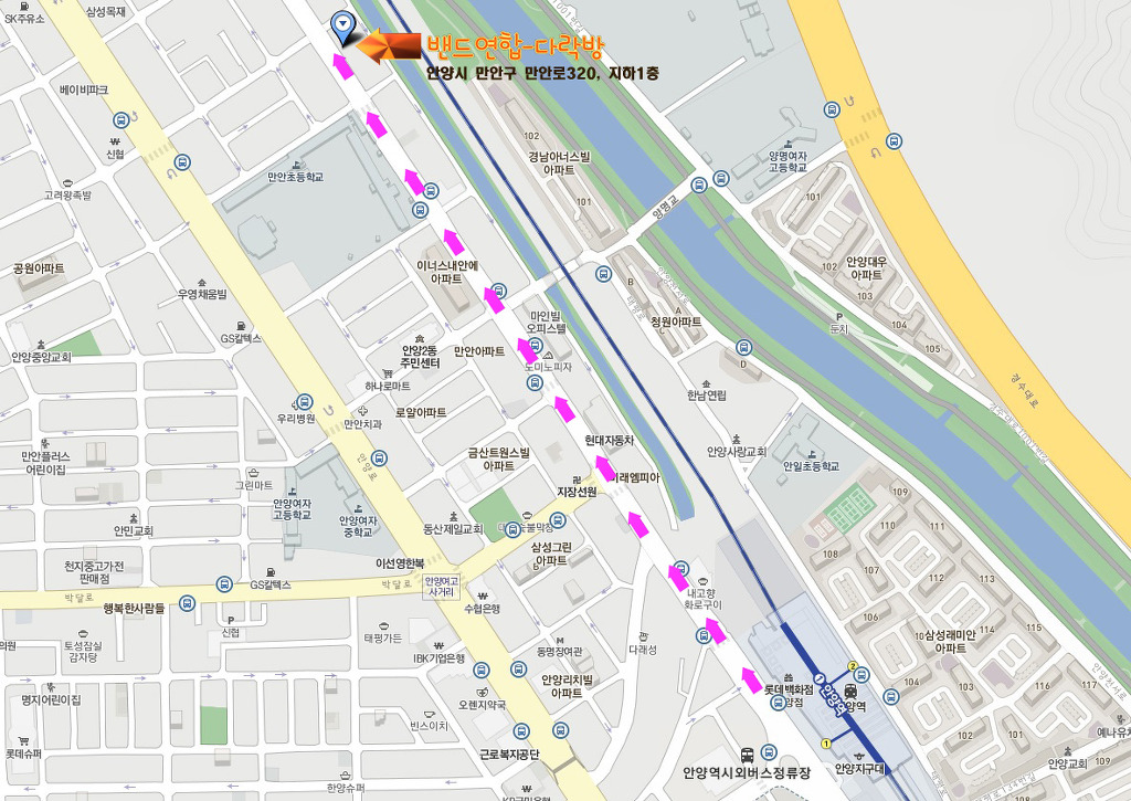 2정거장(만안초등학교)에서 내려 횡단보도까지 걸어오시면 다락밴드 간판이 보입니다.