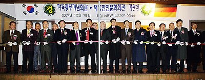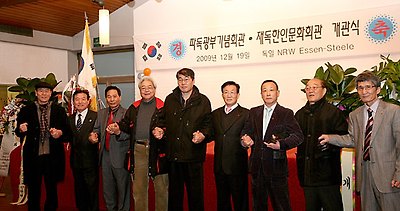 2009년 12월 19일 오랜 숙원인 파독광부기념관 겸 재독한인문화회관 개관식을 가졌다. 에 센市 마이스터싱거 스트라세 90번지에 자리 잡은 기념관의 개막식에서 (왼쪽에서부터) 김이수, 김우영 고문, 손선홍 주독일대사관 본 분관 총영사, 김의택 공사, 이근태 재독한인총연합회 회장, 엘리넥 에센市 시장, 고창원 재독한인글뤽아우프회 회장, 최정일 주독일대사, 신현태 월드옥타 국제통상전략연구소 이사장, 성규환 前 재독한인글뤽아우프회 회장, 최정식 문화회관건립위 이사장 등이 테이프를 끊고 있다.(사진-독일 우리신문)