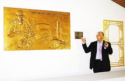 백진건 사무총장이 파독광부 숫자에 맞추어 ‘7936의 꿈’으로 이름진 청동 기념물을 소개하고 있다.(사진-독일 우리신문)