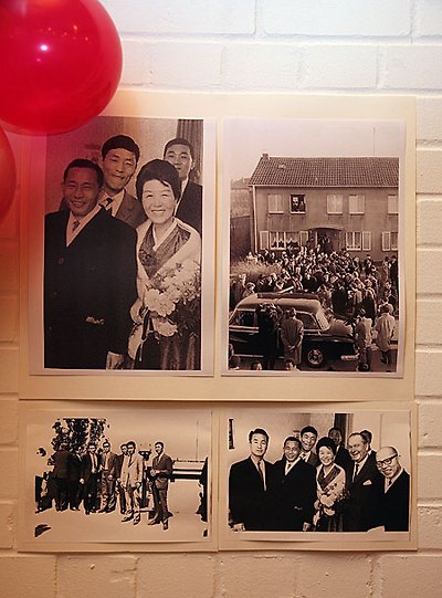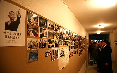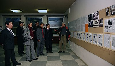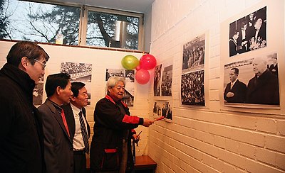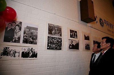 1960년대 서독의 루르, 아헨지역의 광산에 취업을 했던 우리 광부들의 모습을 담은 사진들을 둘러보는 재독 한인글뤽아우프 회원들. 오른쪽 벽면에는 1999년 8월 29일 당시 한나라 부총재였던 박근혜의원이 이 지역을 방문했던 사진과 박대통령이 남긴 휘호를 전시하고 있다.