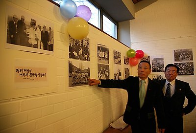 전임 재독한인글뤼아우프 회장인 최정식씨와 성규환씨가 강당에 전시된 박정희 대통령의 방독 당시 찍었던 사진들을 둘러보며 당시를 회고하고 있다.