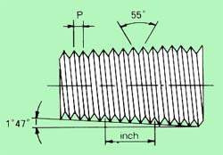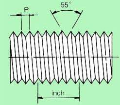 | Size | 인치당 나사산 갯수 | 직경 | 나사산 각도 | 피치(pitch) | |